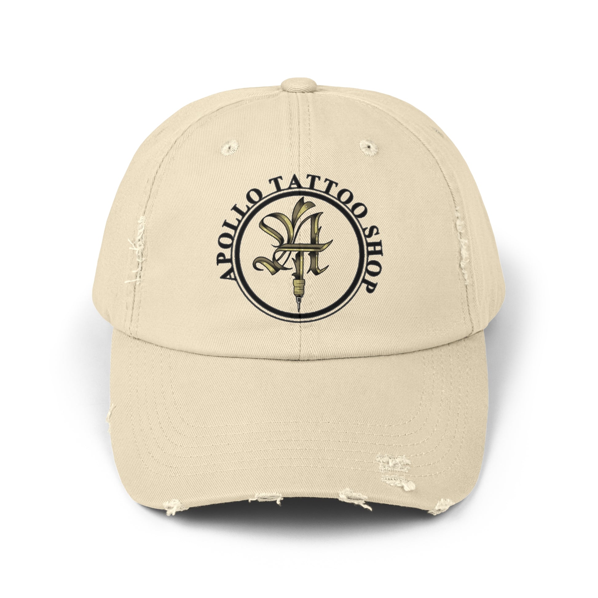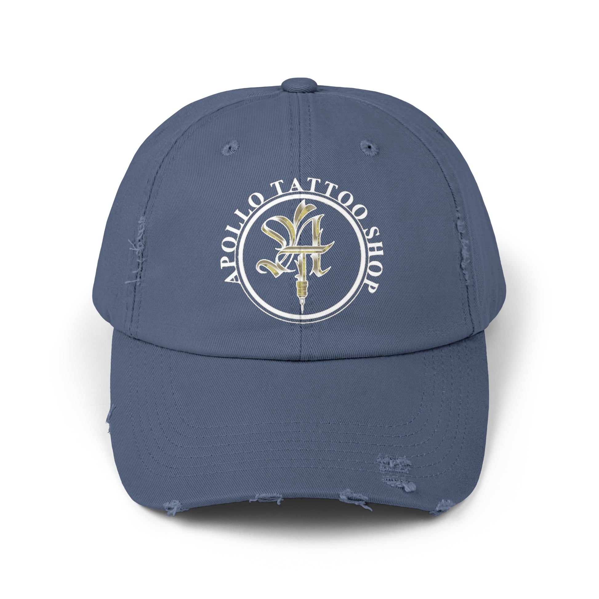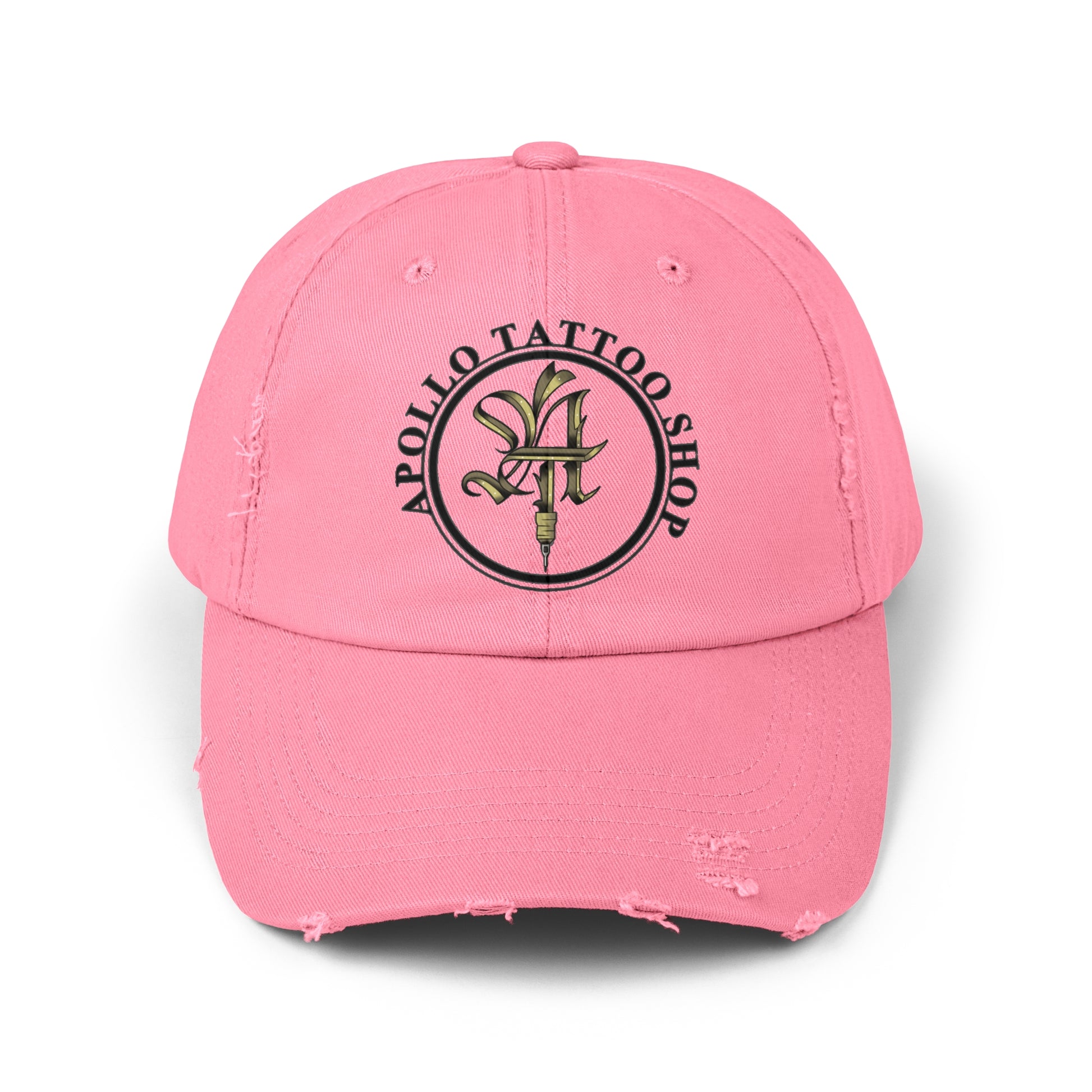 Made with 100% cotton twill for high-end comfort and durability, these Apollo Tattoo Shop distressed hats bring all the style and practicality one needs in daily life. The low profile along with the d-ring closure on a self-fabric hideaway strap ensures both proper protection from the sun and that perfect, adjustable fit.